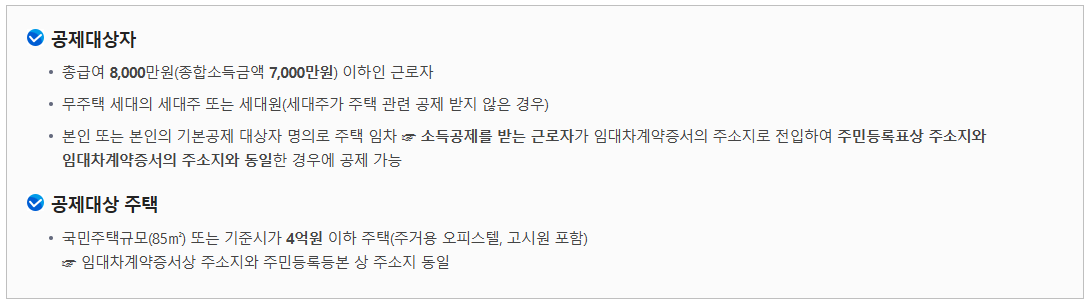 - 공제 대상 주택은 국민주택 규모(전용면적 85㎡ 이하) 또는 기준시가 4억 원 이하의 주택 (주거용 오피스텔, 고시원 포함)