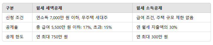 신청 조건 연소득 7,000만 원 이하, 무주택 세대주 급여 조건, 주택 규모 제한 없음 공제율 총 급여 5,500만 원 이하: 17%, 초과: 15% 연 월세 지출액의 30% 공제 한도 연 최대 750만 원 연 최대 300만 원