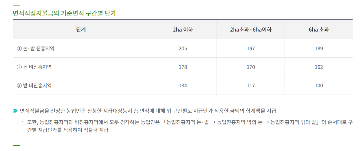 지급대상: 소농 요건을 충족하지 않는 농업인 중 기본적인 요건을 충족하는 경우 지급구간: 농업진흥지역 내외에 따라 세 구간으로 나누어 지급