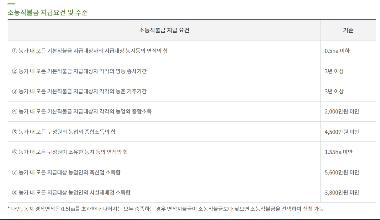 농가 내 모든 구성원의 농지 면적 합이 0.5ha 이하 영농 종사 및 농촌 거주 기간이 각각 3년 이상 농업 외 종합소득이 2,000만원 미만