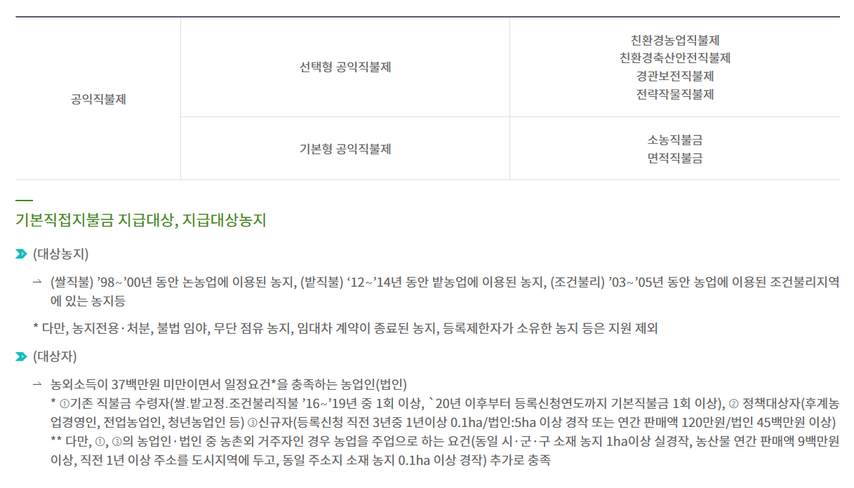 공익직불금 제도는 기본형 공익직불제와 선택형 공익직불제로 나누어집니다.