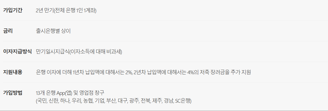 가입자가 매월 일정 금액을 납입하면 정부에서 지원하는 기여금이 추가로 적립됩니다. 최대 5년 만기로, 만기 시 본인 납입금, 정부 기여금, 이자가 합산된 금액을 수령하게 됩니다. 이자소득에는 비과세 혜택이 적용되며, 일정 소득 기준을 충족하는 청년에게는 더욱 유리한 조건이 주어집니다.