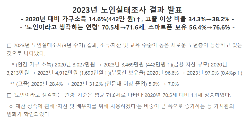2024년 발표된 노인실태조사에 따르면, 현재 노인들이 생각하는 "노인"의 연령은 평균 71.6세로 조사되었습니다. 이는 기존 기준인 만 65세와 비교했을 때 약 6.6세 높습니다.