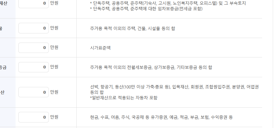 재산은 소득으로 환산되며, 항목이 포함됩니다: 주거용 재산: 집이나 임대보증금 금융 재산: 예금, 적금, 주식 등 자동차: 차량의 가액을 기준으로 평가 재산 환산 시 기본 공제액이 적용되며, 지역에 따라 기준이 달라질 수 있습니다.