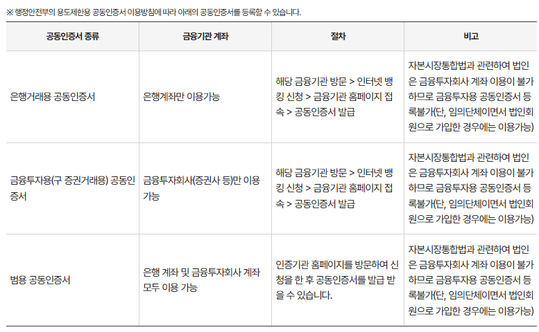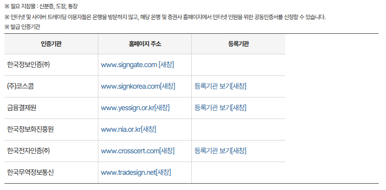 개인: 통장, 도장, 신분증(주민등록증 또는 운전면허증) 은행 계좌가 없는 경우, 신규 계좌 개설 후 공인인증서 이용 신청서를 작성해야 합니다.