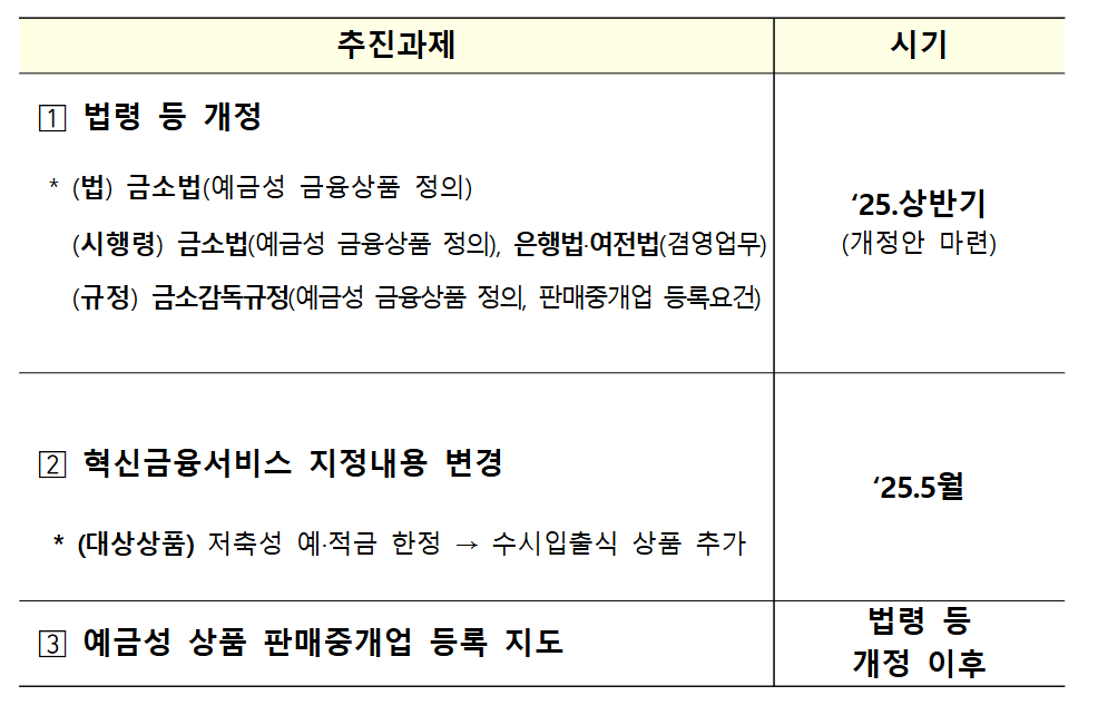 정부는 상반기 중으로 관련 법령 개정을 추진하고 있으며, 5월 중에는 수시입출식 상품의 중개 허용을 골자로 한 혁신금융서비스 지정 내용을 변경할 계획입니다. 법 개정이 완료되기 전까지는 기존 서비스에 대해 혁신금융서비스 지정 기간을 연장해 지속 운영을 보장한다는 방침입니다.