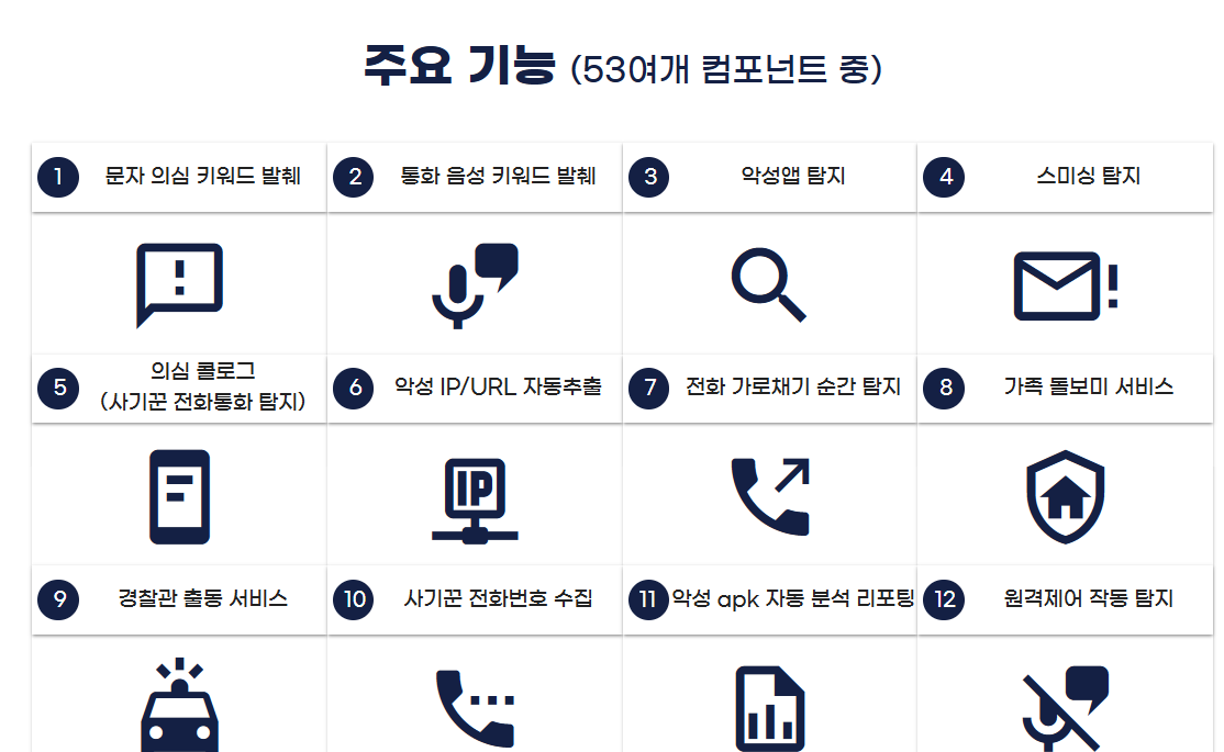 스마트폰 내에 설치된 앱 중 보이스 피싱이나 악성 스미싱과 관련된 의심 앱을 탐지하여 사용자에게 경고 메시지를 전송합니다. 또한 설치 차단 또는 삭제 유도 기능이 포함되어 있어 피해를 사전에 방지할 수 있습니다.