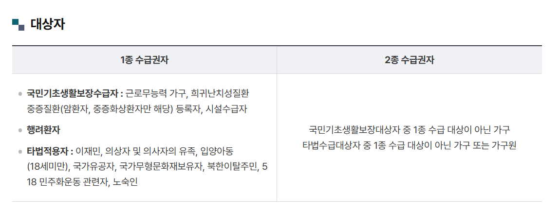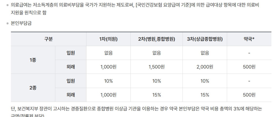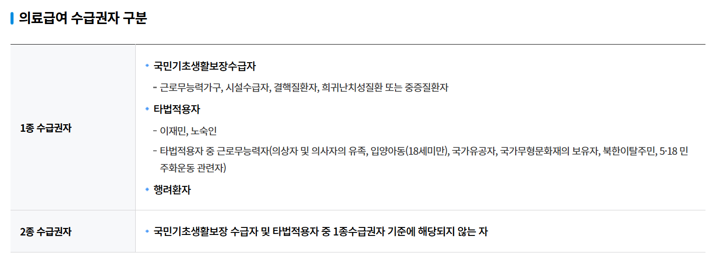 - 1종 수급권자: 가장 혜택이 크며, 대부분의 진료가 무료 또는 소액 부담