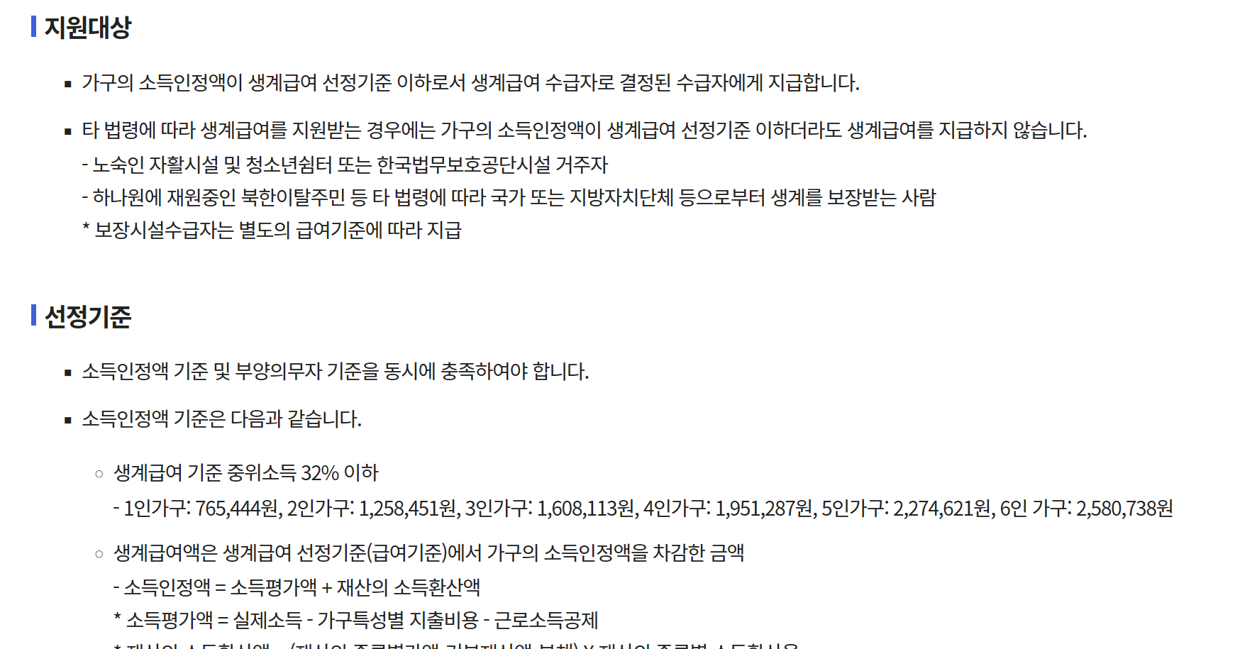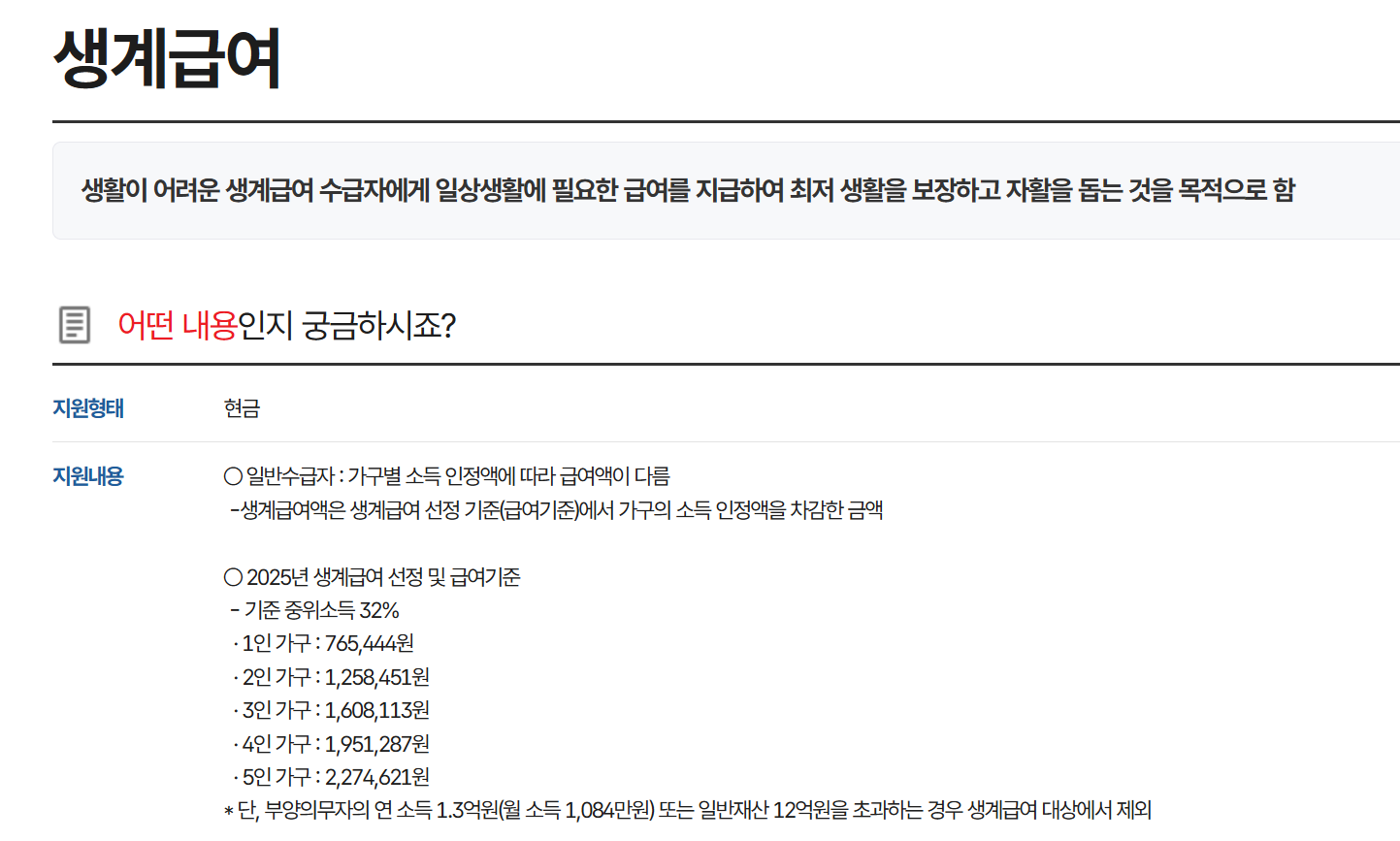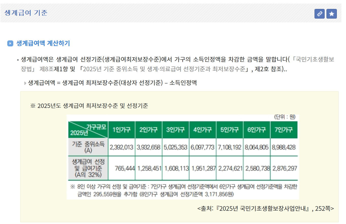 - 2025년 생계급여 자격: 기준 중위소득 32% 이하