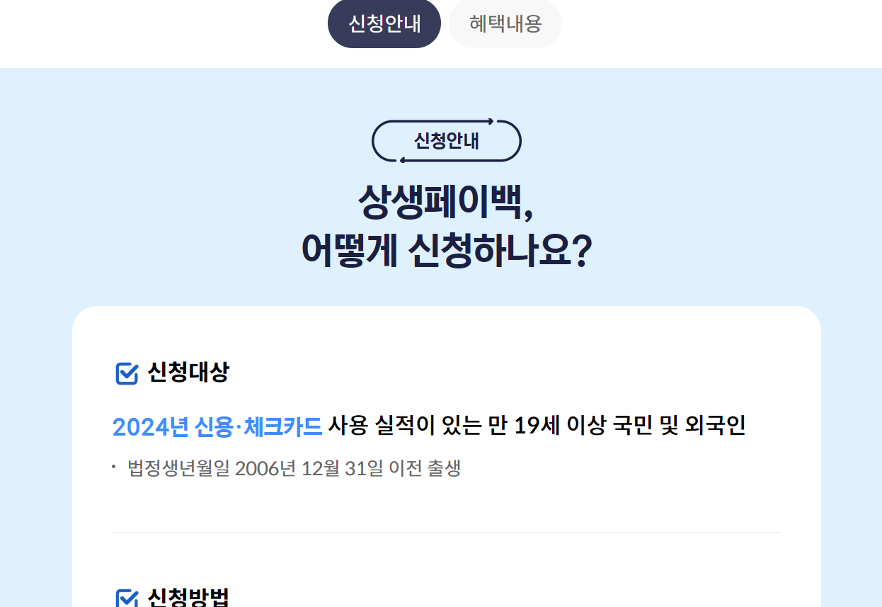 지원 대상은 만 19세 이상 내국인과 외국인 모두 포함되며, 본인 명의의 카드 사용 실적이 있어야 합니다. 다만 법인카드, 가족카드, 그리고 온라인 결제 금액은 제외되며, 반드시 국내 오프라인 매장에서 카드 단말기를 통해 결제된 금액만 인정됩니다. 카드 실적은 개인의 카드사 정보를 기반으로 산정되며, 신용카드와 체크카드 모두 포함됩니다. 해당 조건을 충족하는 소비자는 누구나 상상페이 환급 대상에 해당됩니다.