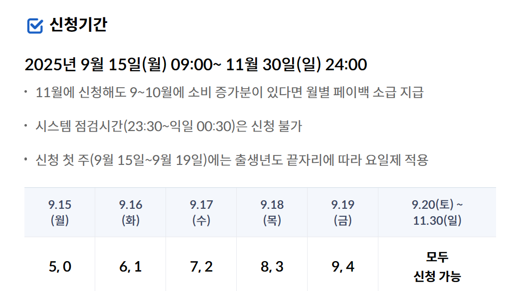 신청 기간은 2025년 9월 15일부터 11월 30일까지이며, 초기에는 출생연도 끝자리 기준 5부제가 적용됩니다. 예를 들어 출생연도 끝자리가 1이나 6인 사람은 월요일, 2나 7은 화요일, 이런 식으로 요일별 신청일이 지정되어 있습니다. 초기 신청이 끝난 이후에는 누구나 자유롭게 신청할 수 있습니다. 온라인 신청이 어려운 분들을 위해 전통시장 상인회, 소상공인 지원센터, 그리고 주요 시중은행(국민, 신한, 하나, 농협) 지점에서도 방문 신청이 가능합니다.