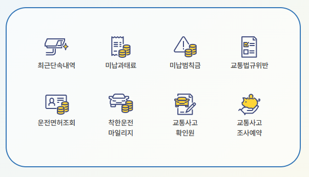 로그인 후 '교통범칙금/과태료' 메뉴에서 최근 단속 내역을 조회할 수 있습니다. 단속 시점부터 1년 이내의 사진과 정보가 제공되며, 과태료나 벌금 납부 여부도 확인 가능합니다.